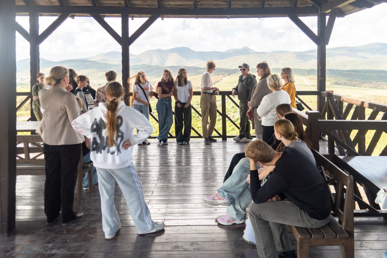 И вот ребята оказались в одном из самых живописных уголков среди виноградников. С вершины холма перед ними открылся завораживающий пейзаж: ровные ряды лоз тянутся вдаль по зеленым склонам, а вдали мерцают озеро Абрау и Черное море. Ученики сразу почувствовали, что попали в уникальное место, и не упустили шанс запечатлеть эту красоту на свои телефоны.