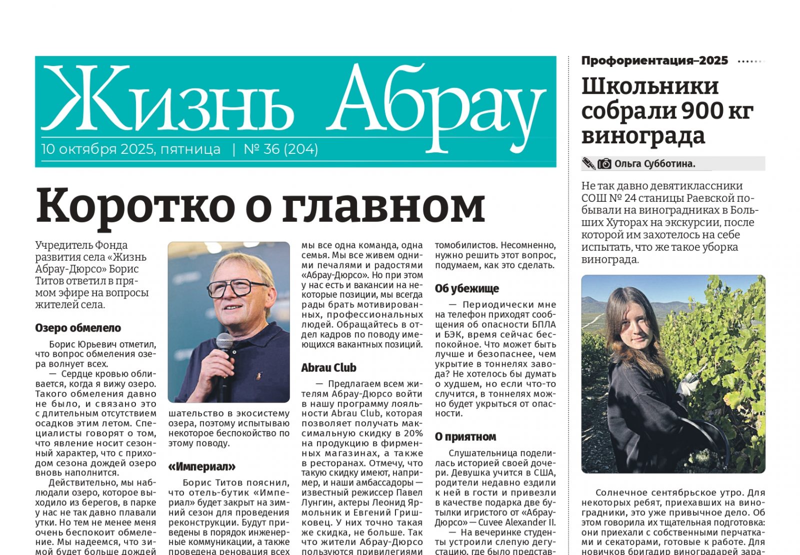 — Предлагаем всем жителям Абрау- Дюрсо войти вࢱнашу программу лояльности Abrau Club, которая позволяет получать максимальную скидку в 20% на продукцию в фирменных магазинах, а также в ресторанах. Отмечу, что такую скидку имеют, например, и наши амбассадоры — известный режиссер Павел Лунгин, актеры Леонид Ярмольник и Евгений Гришковец. У них точно такая же скидка, не больше. Так что жители Абрау-Дюрсо пользуются привилегиями на уровне Павла Лунгина. Отмечу, что и у меня скидка 20%.