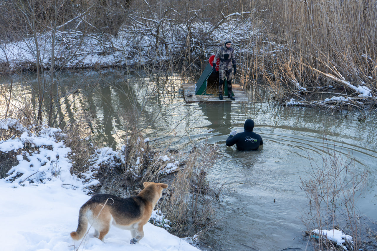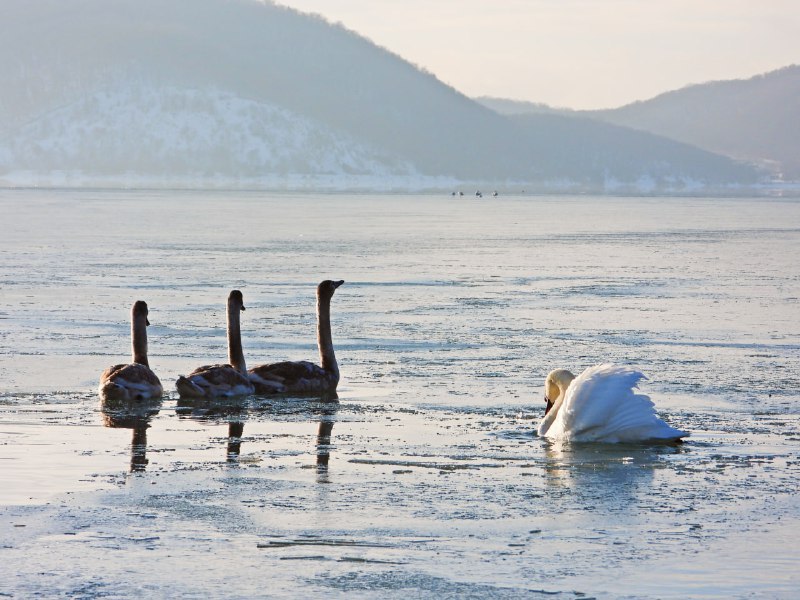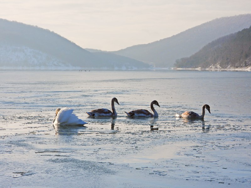 Виноградарь Вячеслав Яровой, отправившись на очередную фотоохоту, заметил в северной части озера четырех молодых лебедей. К утру озеро начало замерзать, и пернатые собрались в полынье возле берега. Один из лебедей меньше других собратьев: щупленький, слабый, тяжело передвигается. Вячеслав отметил, что он держится от других птиц отдельно, лебеди отгоняют его от себя.