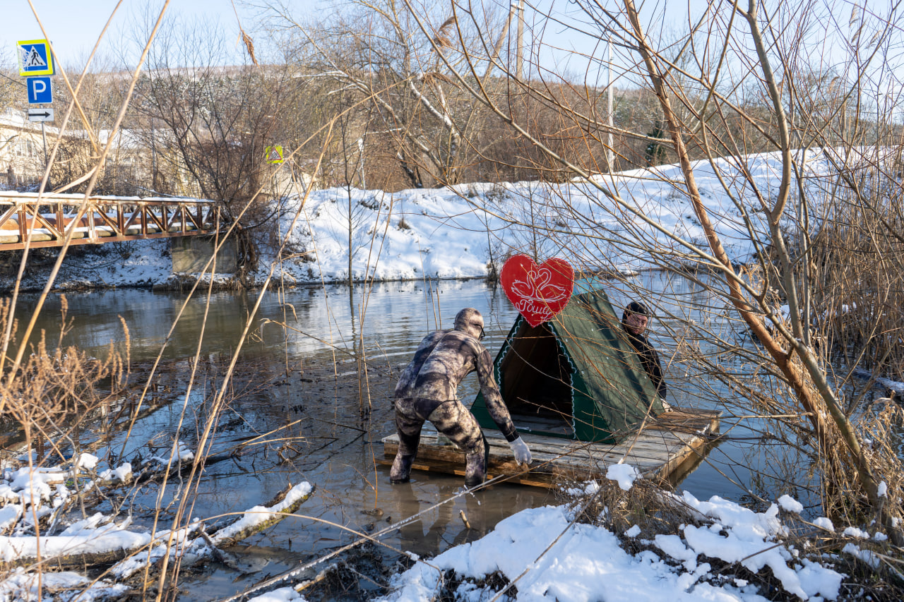 Дом решили установить в речке Абрау за мостом, в начале Аллеи Славы. Чтобы доставить сооружение, пришлось сделать 2 рейса: сначала привезли плот, затем домик.