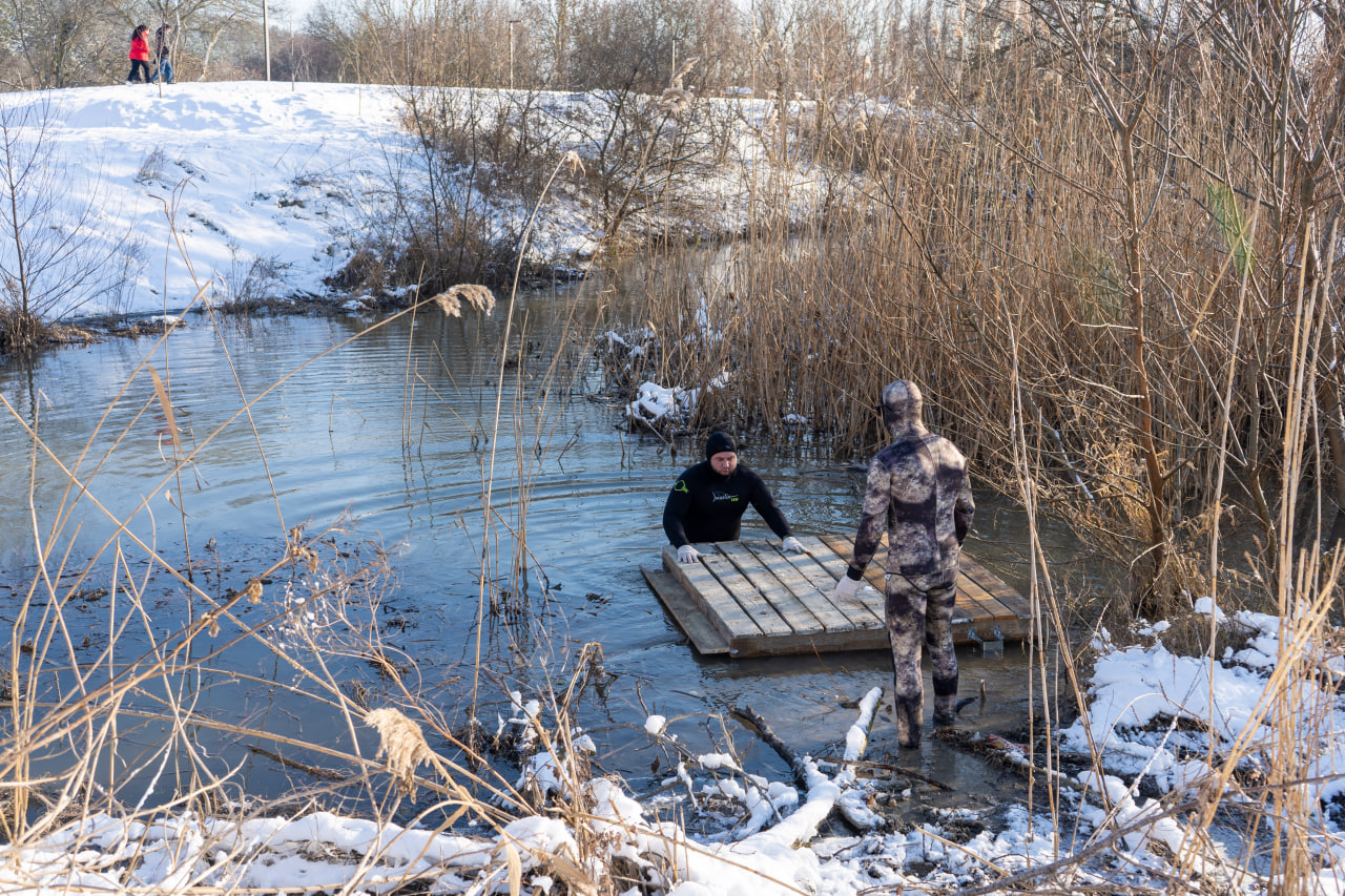 Часть работ пришлось провести в воде — собрать сборную конструкцию и прикрепить плот ко дну водоема сваями, для того чтобы он не уплыл.