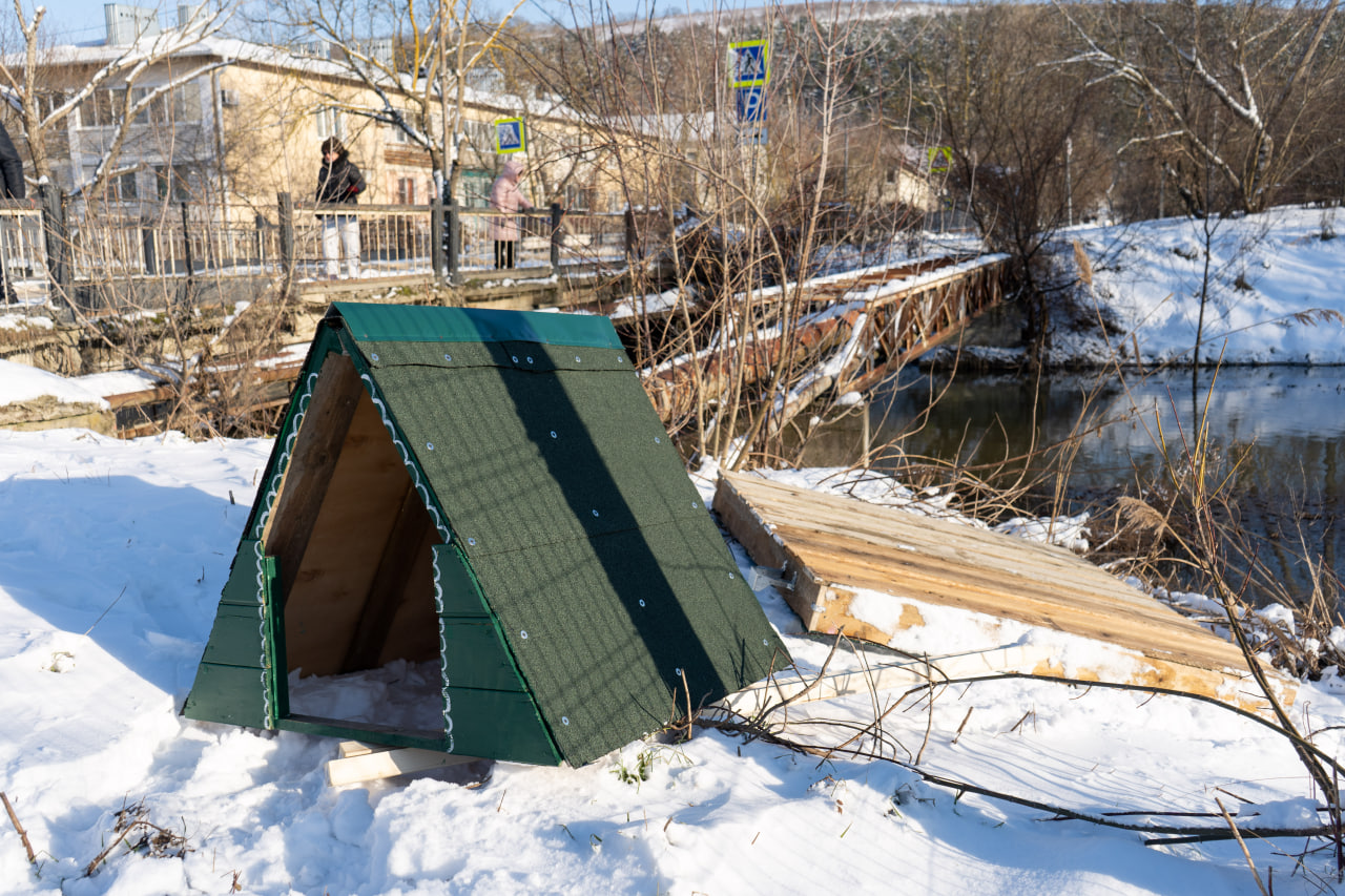 Вот только самого виновника торжества в этот день не оказалось на месте, видимо, уплыл в другую часть озера. Ордер на квартиру так и не вручили. Строители оставили лебедю в домике угощение — свежую хамсу. Надеемся, лебедь поймет, увидев новую конструкцию на речке, что этот дом построен именно для него.
