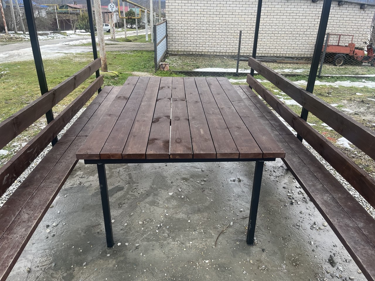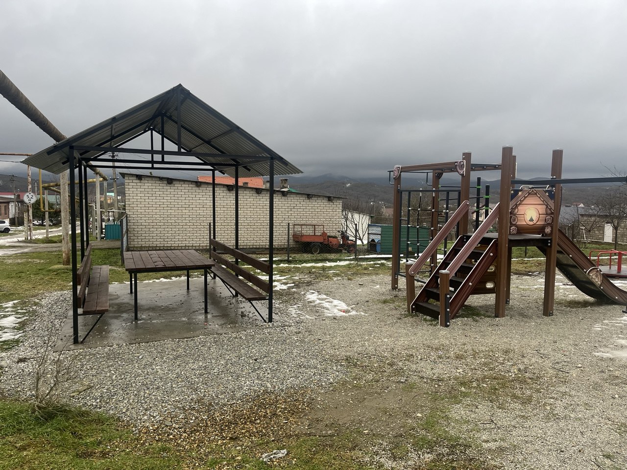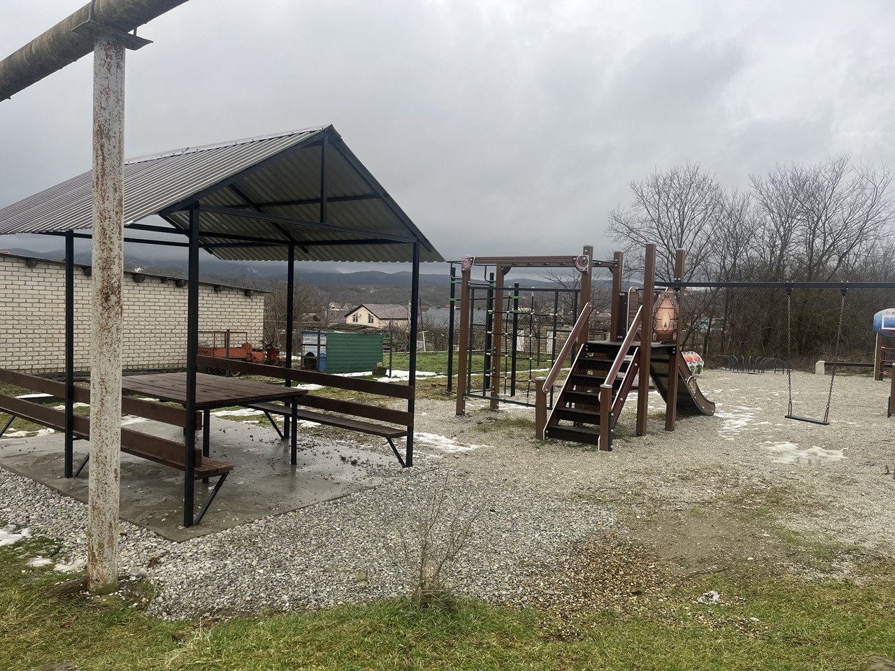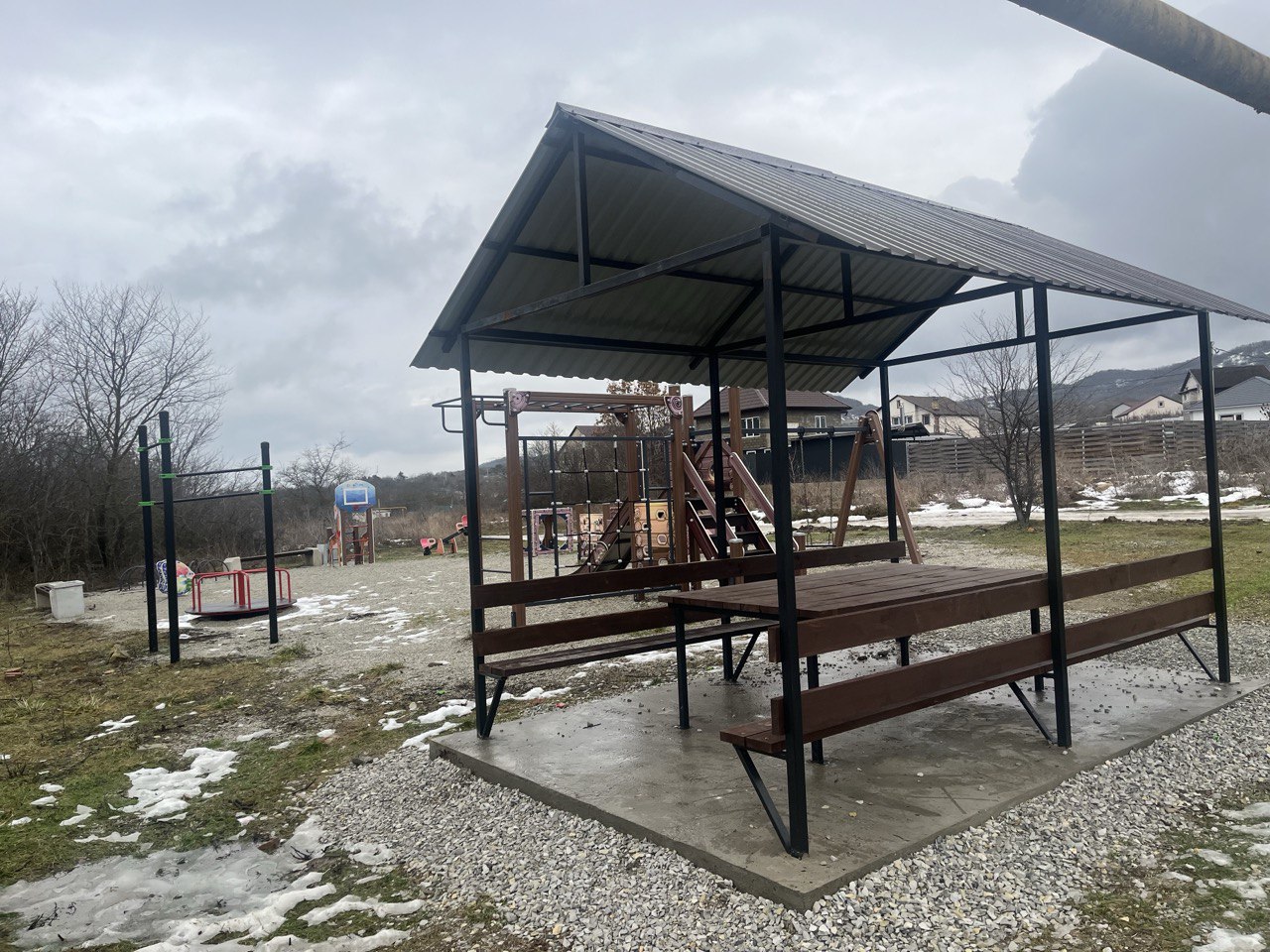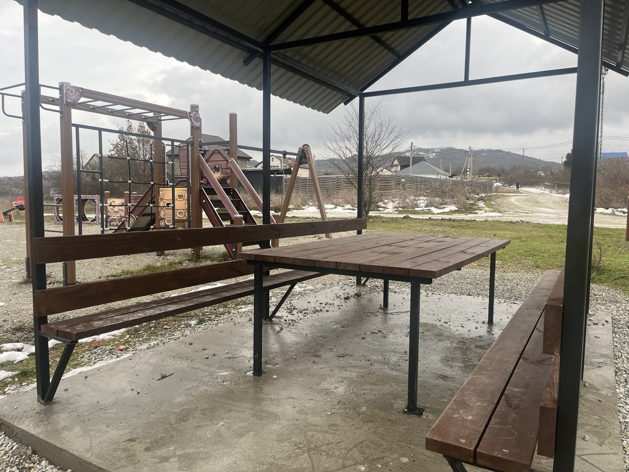 Сейчас на площадке нет деревьев, чтобы укрыться летом от палящего солнца, поэтому навес над скамейками и столом кстати.