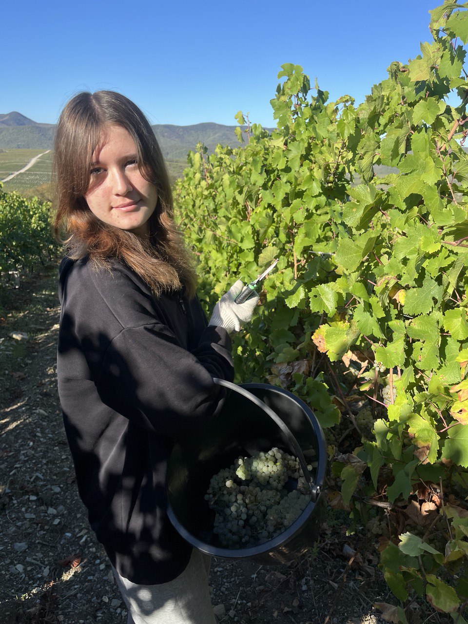 – Приехала на уборку впервые, и мне здесь очень нравится, — говорит Арина. — Я очень удивилась, как здесь все организовано: кусты такие аккуратные, похожи на экзотические растения! Сделала для себя кучу открытий: например, не знала, что виноград нужно обрезать, думала, что он растет на арках, как у нас в домах.