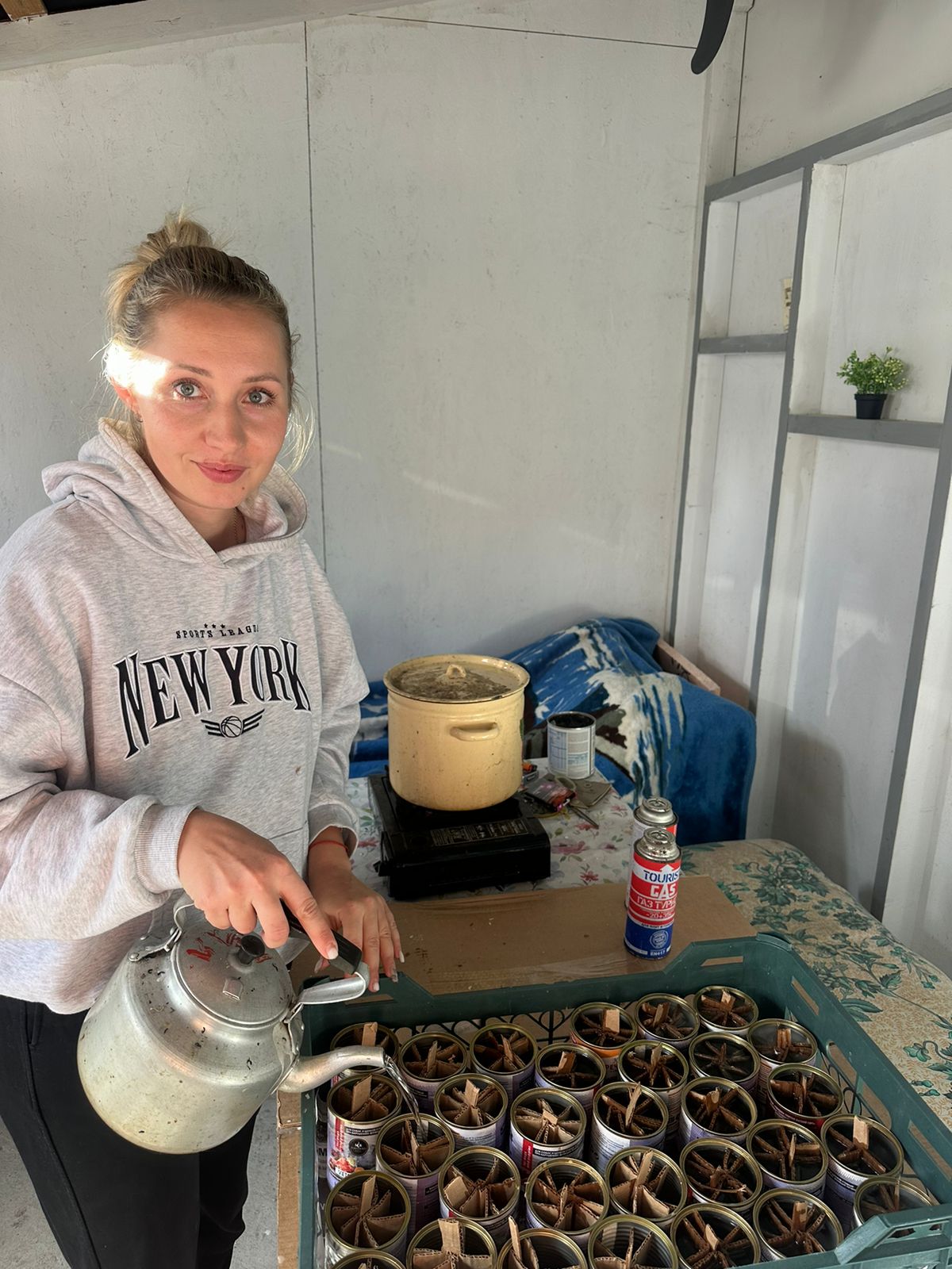 Есть у нас и те, кто вяжет носочки. Для них Любовь Бандура закупает пряжу. Стараются связать как можно больше пар до наступления зимних холодов, укомплектовать бойцов. Другие заливают окопные свечи. Сейчас, кстати, идет сбор жестяных банок в администрации села.