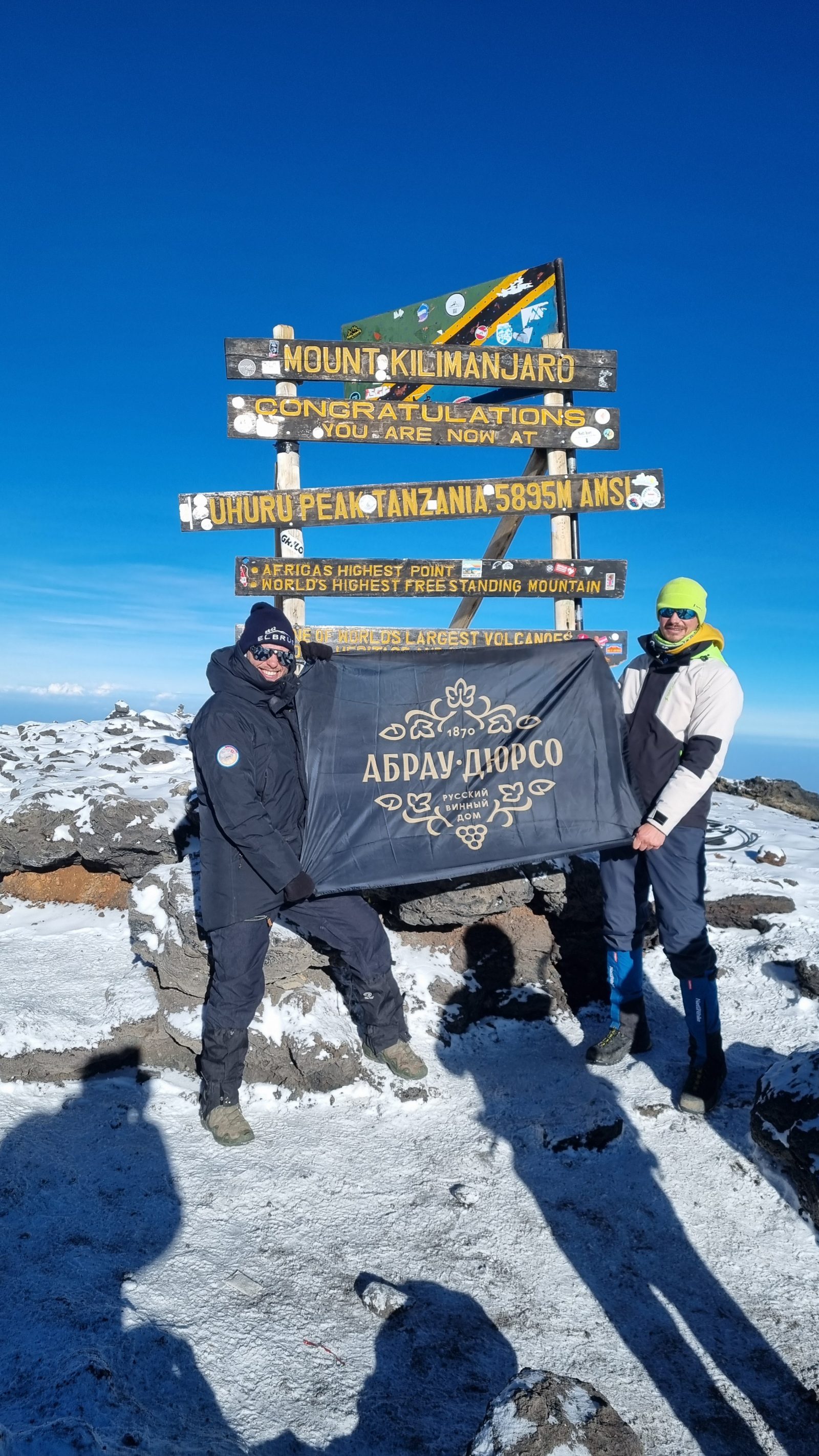 Наш земляк поднялся на одну из семи вершин мира и растянул флаг «Абрау-Дюрсо» на высоте 5895 метров, а также выпил с друзьями бутылку безалкогольного игристого Abrau Light.