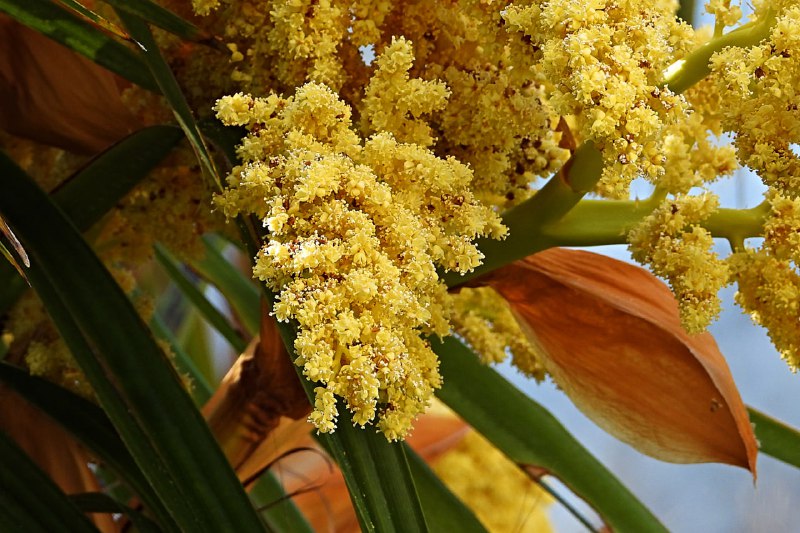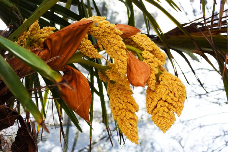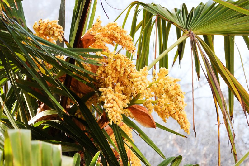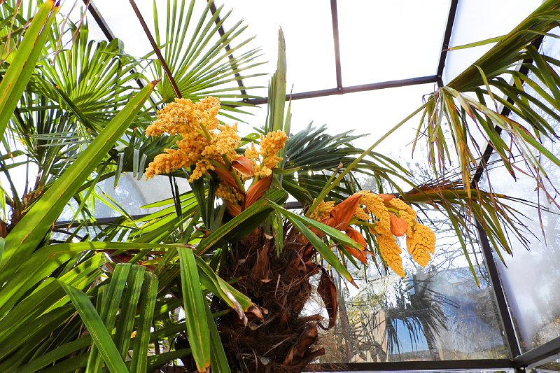 Пока увидеть цветение удалось не всем: после зимы пальмы еще находятся в специальных теплых домиках-теплицах из поликарбоната. Но самые внимательные гости все-таки замечают на верхушках необычные метелки — именно так называются соцветия у пальм. Множество мелких цветков, источающих приятный аромат, вырастают из пазух листьев и могут достигать почти метровой длины.
